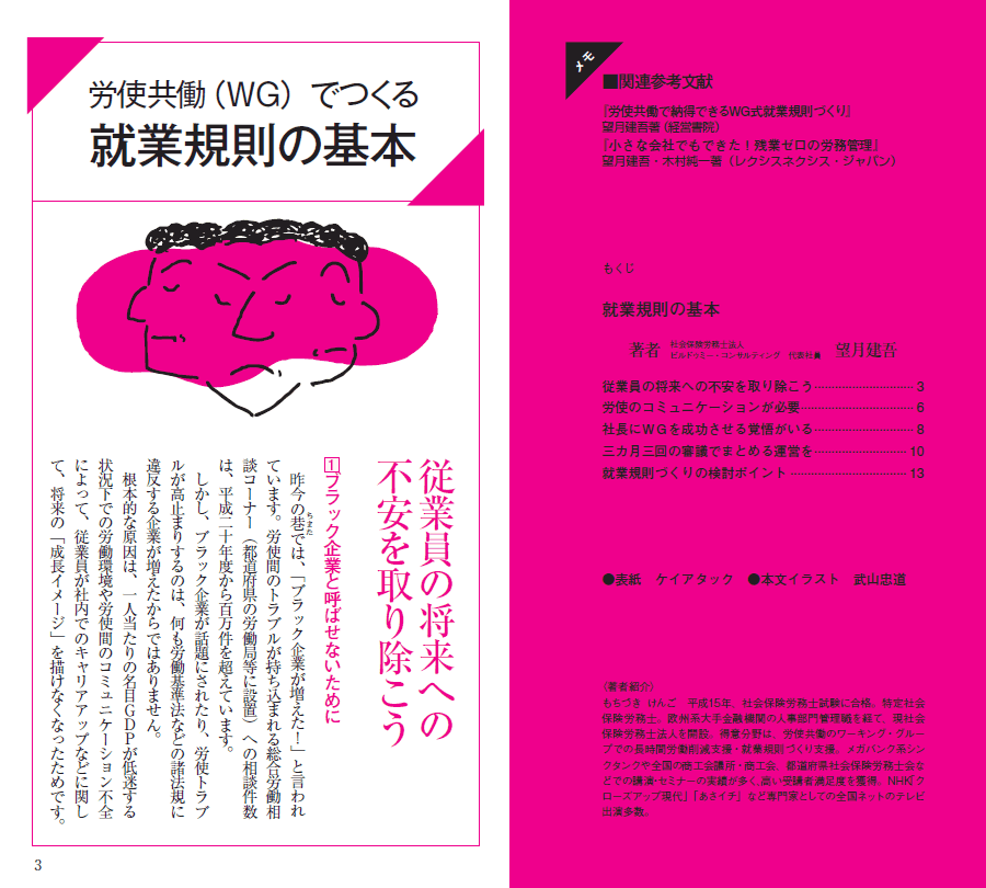 望月先生や一門の勤務社労士の支援で多くの企業で導入され、2冊目のご著書のテーマにもなったWG式就業規則づくりのエッセンスを20数ページに凝縮している力作です。「いい会社」は必ずやっているWGでの就業規則づくりにぜひ取り組んで頂きたくて、本当は表に出したくなかったこの小冊子を特典にお付けします。